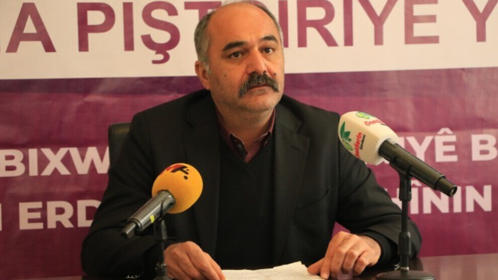 أدلى الرئيس المشترك لمؤتمر المجتمع الديمقراطي KCD بدران أوزتورك ببيان بخصوص منع أعمال التبرعات وتعيين الأوصياء، في مركز تنسيق الأزمات التابع لحزب الشعوب الديمقراطي HDP في باياس في آمد.