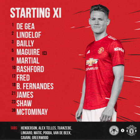 دي خيا في حراسة المرمي ثم فيكتور ليندلوف، بايلي، ماجواير، مارسيال، راشفورد، فريد، فيرنانديز، جيمس، شو، ماكتوميناي