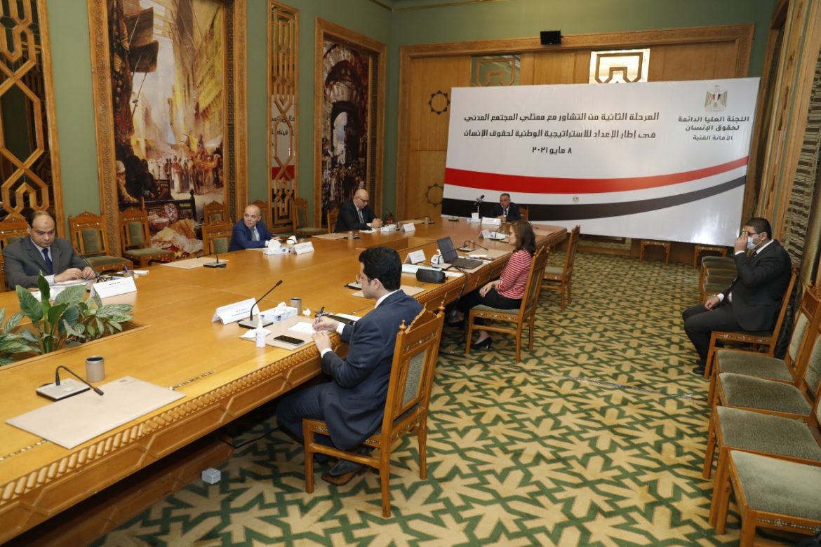فى إطار النهج التشاوري الموسع الذى تتبعه اللجنة العليا الدائمة لحقوق الإنسان في عملية الإعداد لأول إستراتيجية وطنية لحقوق الإنسان، وهو مايتسق مع عملية التخطيط القائم على المشاركة الذي تنتهجه الدولة حاليًا، عقدت الأمانة الفنية للجنة العليا يوم السبت 8 مايو إجتماعاً مع عدد من ممثلي المجتمع المدنى والشخصيات العامة وبمشاركة السفير د. أحمد إيهاب جمال الدين مندوب مصر الدائم لدى الأمم المتحدة بجنيف. وأكد السفير/علاء رشدي مساعد وزير الخارجية والقائم بأعمال رئيس الأمانة الفنية للجنة العليا الدائمة لحقوق الإنسان أن اللجنة العليا تعتبر منظمات المجتمع المدني شريكًا أساسيًا في عملية تعزيز وحماية حقوق الإنسان بكافة أبعادها، ومن ثم فهى تحرص على تعزيز التواصل، والتنسيق، والتشاور معهم.وتم خلال الجلسة إستعراض أبرز ملامح مسودة الإستراتيجية ونتائجها المستهدفة، ثم أعقب ذلك إجراء حوار بناء ومنفتح حول ملاحظات ومقترحات المشاركين. ولقد أثنى المشاركون فى الجلسة على مبادرة الدولة لإعداد الإستراتيجية وإنفتاح اللجنة العليا على الإستماع إلى مختلف الآراء والمقترحات فى إطار عملية إعدادها. كما تطرقتمداخلاتهم لأبرز القضايا والتحديات ذات الصلة بتعزيزحقوق الإنسان ورؤيتهم بالنسبة للتعامل الأمثل معها.وأكد السفير/علاء رشدي أن الإستراتيجية تعد بداية مرحلة جديدة للتخطيط الإستراتيجي فى مجال تعزيز حقوق الإنسان، وأن بعض القضايا تستوجب مواصلــة بحثها وتحديد أفضل السبل للتعامل معها وذلك من خلال إستكمال الحوار البناء مع مختلف الأطراف المعنية بما فيها المجتمع المدني.