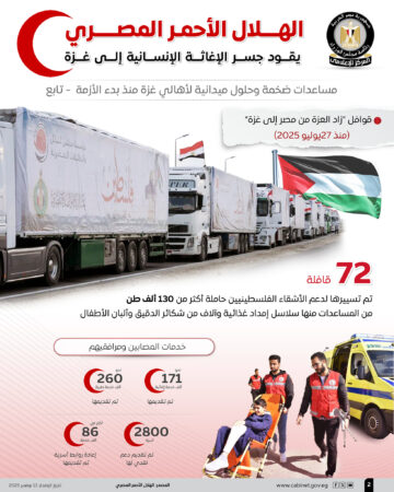 بالإنفوجراف.. المركز الإعلامي لمجلس الوزراء: الهلال الأحمر المصري يقود جسر الإغاثة الإنسانية إلى غزة