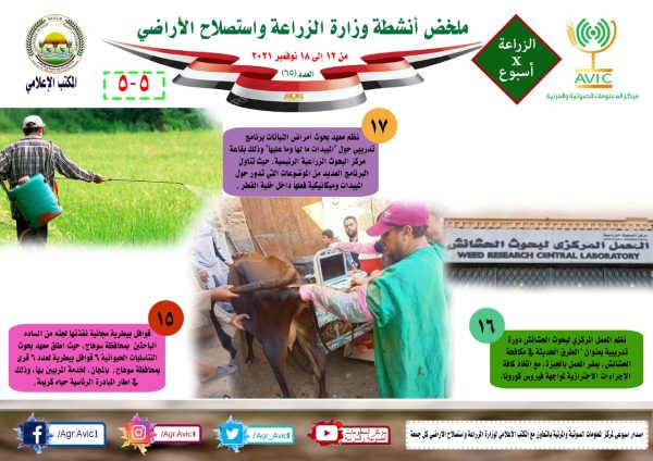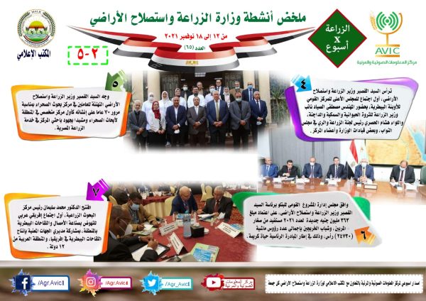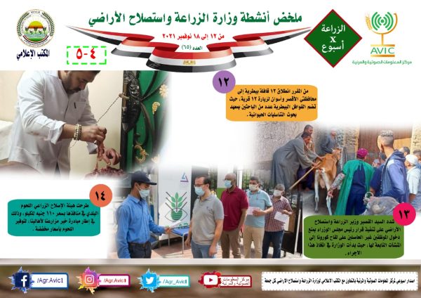 يذكر ان مركز المعلومات الصوتية والمرئية، بوزارة الزراعة واستصلاح الأراضي، والمكتب الاعلامي للوزارة، يصدران الجمعة من كل اسبوع، انفوجرافا وفيديو باسم: الزراعة في اسبوع، لالقاء الضوء على ملخص ما تم من انشطة وجهود، بكافة القطاعات والهيئات، التابعة للوزارة، فضلا عن انفوجراف وفيديو كل ثلاثاء باسم: الزراعة في كل مصر، حول انشطة وجهود القطاع الزراعي، بالمحافظات المختلفة.