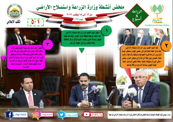 اصدر مركز المعلومات الصوتية والمرئية، التابع لوزارة الزراعة واستصلاح الاراضي، “الانفوجراف الاسبوعي” في نسخته رقم ٦٥ ، حول الحصاد الاسبوعي لأهم أنشطة الوزارة، خلال الاسبوع الماضي في الفترة من ١٢ الى ١٨ نوفمبر الجاري، وذلك بالتعاون مع المكتب الاعلامي للوزارة، كما أصدر المركز ايضا ملخصا بالفيديو، حول انشطة الوزارة خلال نفس الفترة.