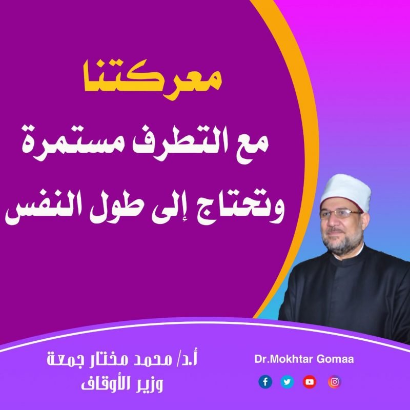 صرح أ.د/ محمد مختار جمعة وزير الأوقاف أنه في ضوء المعطيات والمتغيرات والتحديات الإقليمية والدولية ، يجب عدم إعطاء أي فرصة لخلايا الجماعات المتطرفة لإعادة بناء أو إنتاج أنفسها من جديد بأي شكل من الأشكال .