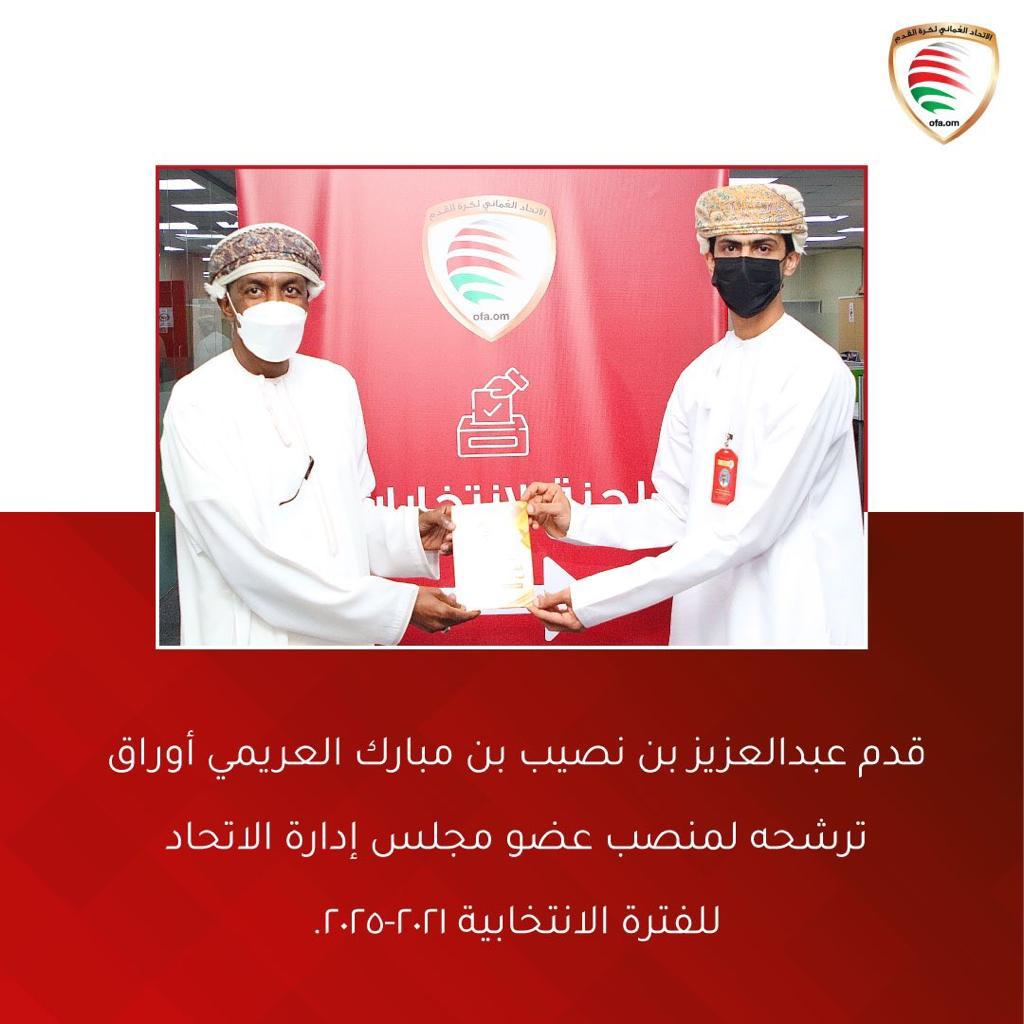 قدم لاعب منتخبنا السابق ونادي العروبة عبدالعزيز بن نصيب العريمي أوراق ترشحه لمنصب عضو بالاتحاد العماني لكرة القدم للفترة الانتخابية 2021-2025.