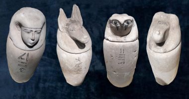 يعرض مجموعة من الاوانى الكانوبية مصنوعة من المرمر