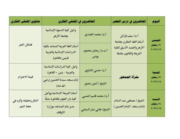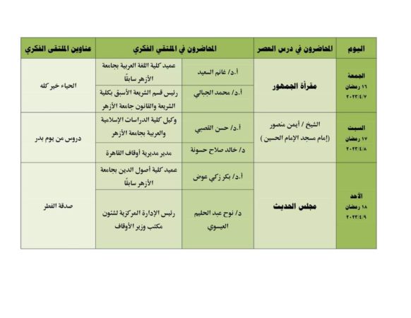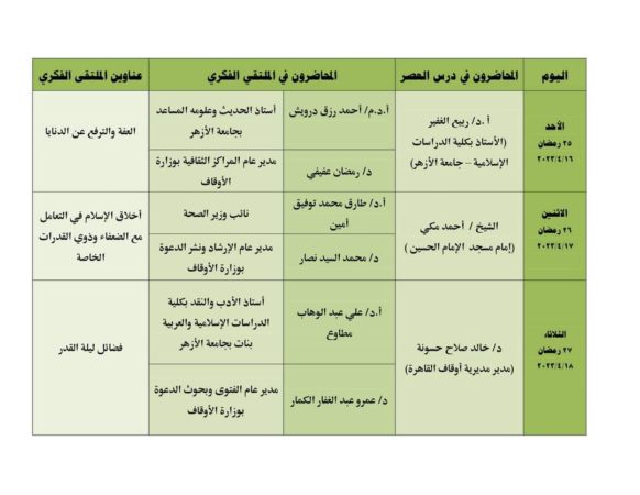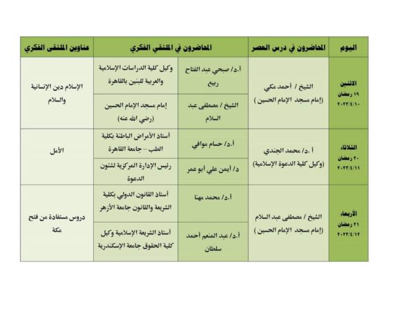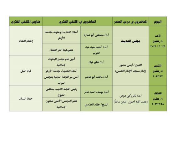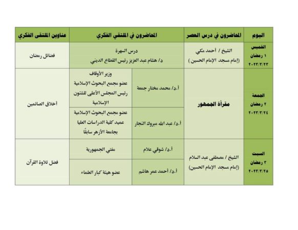 في إطار الدور الدعوي والتثقيفي الذي تقوم به وزارة الأوقاف وحرصها على تهيئة الأجواء الإيمانية في شهر رمضان المبارك من خلال الفاعليات والأنشطة التي ستقام في مساجد مصر عامة ومسجد سيدنا الإمام الحسين (رضي الله عنه) خاصة؛ يسرنا أن نعلن عن أسماء وموضوعات ملتقى الفكر الإسلامي، بمسجد الإمام الحسين (رضي الله عنه) بالقاهرة؛ خلال شهر رمضان المبارك 1444هـ ، 2023م، وذلك فضلًا عن القراء والمبتهلين ومقدمي ملتقى الفكر من الإعلاميين، وذلك على النحو التالي :