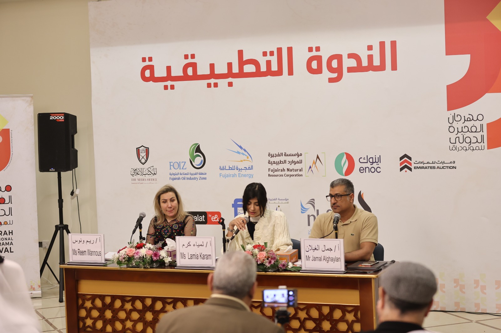 أدارت الندوة التطبيقية الخامسة الفنانة لمياء كرم من مصر، وبدأت حديثها بالترحيب بالحضور والتوجه بالشكر لفريق العرض والتعريف بالمشاركين في هذا العمل، ومن ثم أتاحت الفرصة للحضور من أجل إبداء آرائهم وانطباعاتهم حول العرض الذي كان غنيا بأداء بسمعة مهرجان الفجيرة الدولي للمونودراما.. هنا الفنان عمر الجاسر من السعودية فريق العرض من خلال رسالة العرض العميقة، وأداء الممثلة المتميز، بالإضافة الى الرؤية الاخراجية المتميزة..