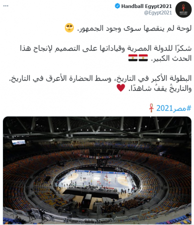 ونشر حساب البطولة على تويتر صورة للصالة المغطاة، وعلق عليها: “لوحة لم ينقصها سوى وجود الجمهور، شكرًا للدولة المصرية وقياداتها على التصميم لإنجاح هذا الحدث الكبير، البطولة الأكبر فى التاريخ، وسط الحضارة الأعرق فى التاريخ. والتاريخُ يقفُ شاهدًا.