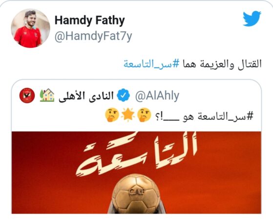رد حمدى فتحى نجم النادي الأهلي على السؤال الذى طرحته الصفحة الرسمية للنادي الأحمر عبر تويتر عن سر تتويج المارد الأحمر بلقب دوري أبطال أفريقيا، وحصد النجمة التاسعة في مسيرته، بعد الفوز على الزمالك بهدفين لهدف في المباراة النهائية. وقال حمدى فتحى عبر حسابه على تويتر، “القتال والعزيمة هما سر التاسعة”.