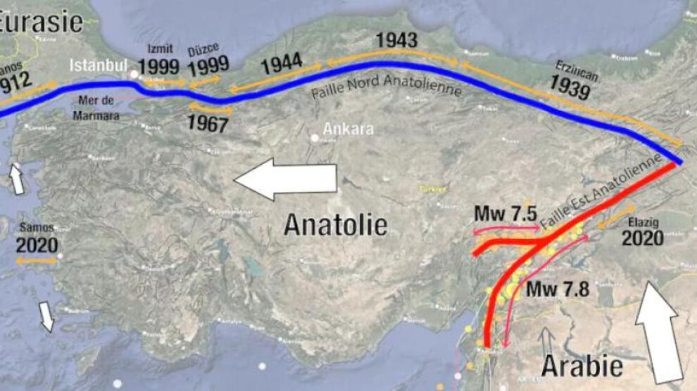 يقول الخبيران الفرنسيان المتخصصان في الزلازل، رومين جولفي من جامعة غرينوبل، ولوران جوليفيت من جامعة السوربون، إن «صدع شمال الأناضول، تمزق مثل سقوط صف من الدومينو في سلسلة من الزلازل التي بلغت قوتها 7 درجات، والتي انتشرت طوال القرن العشرين، ويخشى أن تكون تركيا على موعد خلال السنوات المقبلة مع عدد كبير من الزلازل».