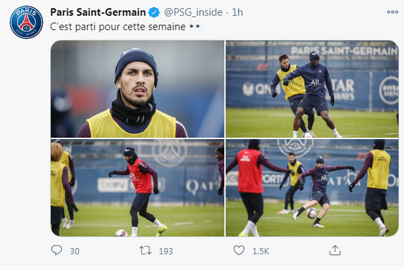 عاد البرازيلي نيمار جونيور دا سيلفا، نجم نادي باريس سان جيرمان الفرنسي، اليوم الاثنين، للمشاركة فى التدريبات الجماعية للفريق، ونشر النادي الباريسي صورة عبر حسابه الرسمي على موقع تويتر لمشاركة نيمار فى التدريبات الجماعية برفقة زملائه وعلق على صورة نيمار، “أنباء سارة تبعث على الابتسامة”.