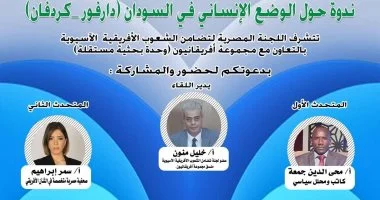 تقيم اللجنة المصرية لتضامن الشعوب الإفريقية الآسيوية، بالتعاون مع مجموعة أفريقانيون (وحدة بحثية مستقلة) ندوة حول الوضع الإنساني في السودان (دارفور _كردفان)، وذلك يوم الأربعاء المقبل 10 سبتمبر الحالي، في تمام الساعة 7 مساء، بمقر اللجنة بالعجوزة.