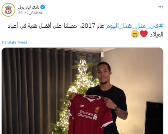 ووجه نادي ليفربول رسالة معايدة إلى الهولندي فان دايك تعتبر الأفضل، حيث استعاد بطل الدوري الإنجليزي ذكريات مرور ثلاث سنوات على انضمامه لكتيبة الريدز فى مثل هذا اليوم، وعلق ليفربول على هذه الذكرى قائلا، “فى مثل هذا اليوم عام 2017، حصلنا على أفضل هدية فى أعياد الميلاد”.
