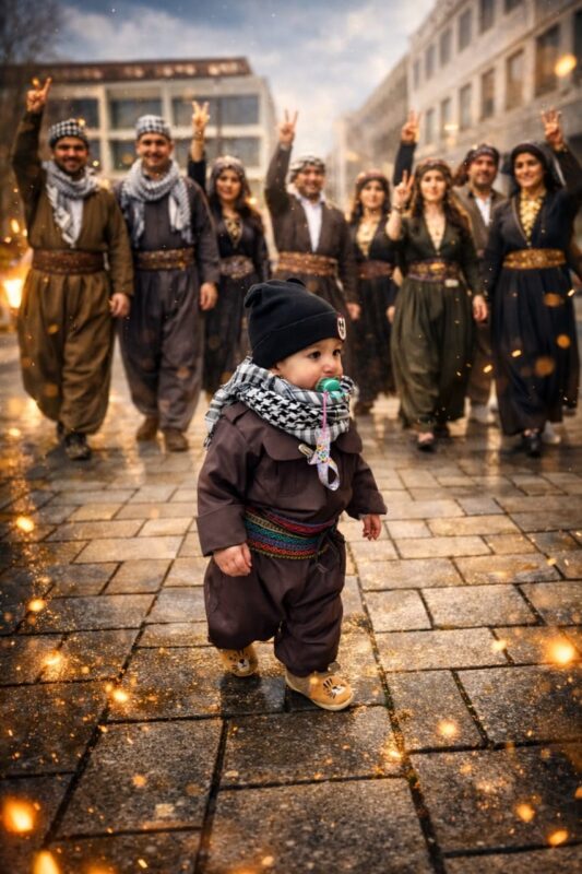 كان جودي (الذي لم يتجاوز عمره خمسة عشر شهراً) يرتدي زيه الكردي التقليدي الصغير، وقد بدت عليه ملامح الفخر البريء، كأنه يدرك – بطريقته الطفولية الخاصة – أنه لا يمشي في ساحة عادية، بل في ذاكرة شعب كامل.