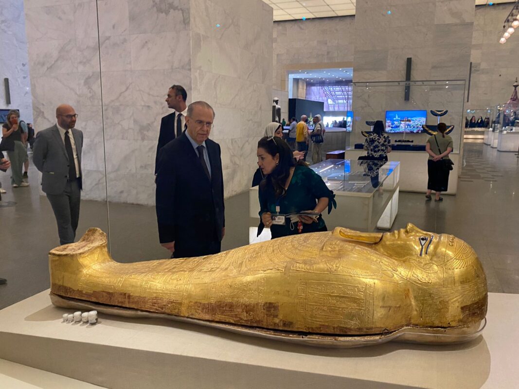 واصطحبت وزير الخارجية والوفد المرافق له الدكتورة ماريان عادل أمينة المتحف، في جولة داخل المتحف شملت زيارة قاعات العرض المركزي والمومياوات الملكية والنسيج المصري التى تم افتتاحها مؤخرا.