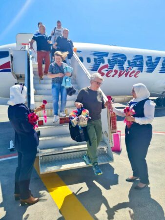 وقد تم استقبال الطائرتين برش المياة كتقليد دولى متبع عند استقبال أول رحلة للمطار، كما قام فريق من العلاقات العامة بمطاري الغردقة ومرسى مطروح باستقبال الركاب وإنهاء إجراءات وصولهم بسهولة ويسر، كما قام أعضاء مكتبي الهيئة المصرية العامة للتنشيط السياحي بالغردقة ومطروح بالترحيب بالسائحين وطاقم الطائرتين واستقبالهم بالورود وتوزيع النشرات والمواد الدعائية عن المدن السياحية المصرية، كما تم استقبالهم بفرق من الفلكلور الشعبي وتوزيع الهدايا التذكارية عليهم.