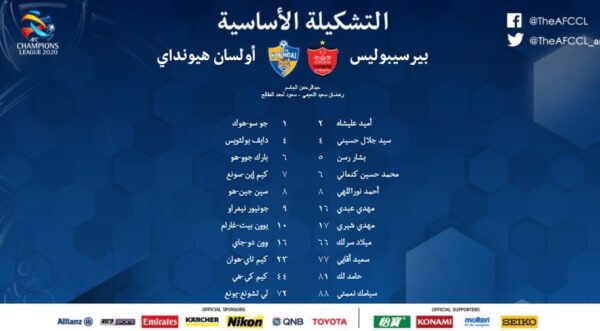 وتمثل التشكيل الرسمي لفريق برسيبوليس ضد أولسان هيونداي كالتالي:
