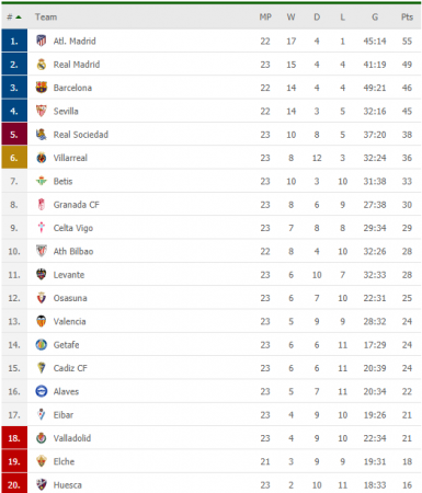 وجاء جدول ترتيب الدوري الاسباني قبل انطلاق الجولة الـ24، كالتالى..