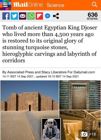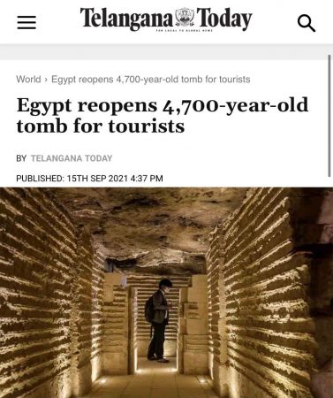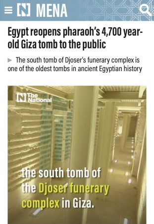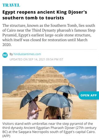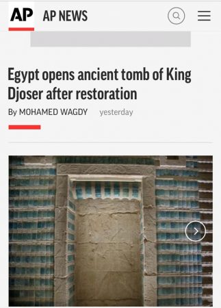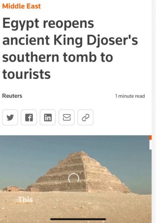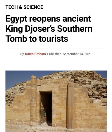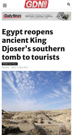 تصدر خبر افتتاح مشروع ترميم المقبرة الجنوبية للملك زوسر والذي افتتحه الدكتور خالد العناني وزير السياحة والآثار أول أمس الاثنين، أخبار الصحف ووكالات الأنباء العالمية، من بينها رويترز و الاسوشيتد بريس و ABC News و الواشنطن بوست و بلومبورج و لوس انجلوس تايم وصوت امريكا و غيرهم، حيث وصفته بأحد أهم الافتتاحات الأثرية التي تعمل علي تنشيط حركة السياحة الى مصر.