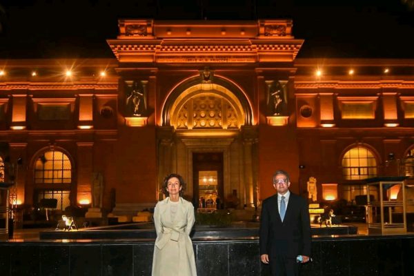 استقبل الدكتور خالد العناني وزير السياحة والآثار، منذ قليل، بالمتحف المصري بالتحرير، السيدة أودري أزولاي رئيس منظمة اليونسكو والوفد المرافق لها، فور وصولهم إلى القاهرة في زيارة تستغرق ٤ أيام، وذلك تلبية للدعوة التي وجهها لها السيد الوزير للمشاركة في حضور موكب المومياوات الملكية المقرر انطلاقه غداً السبت ٣ أبريل الجاري.