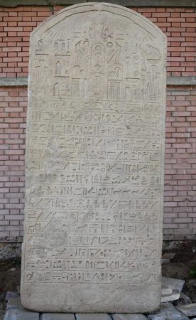 وأنها مصنوعة من الحجر الرملي ويعلوها قرص الشمس المجنح حفر عليها خرطوش للمك واح- ايب- رع- خامس ملوك الأسرة 26 و 15 سطراً من الكتابة الهيروغليفية.