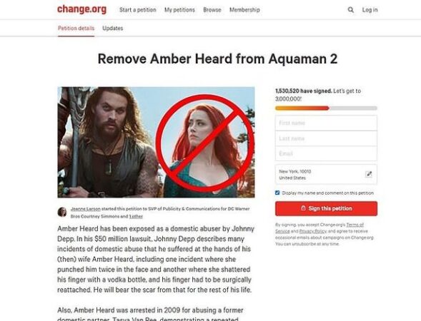 حصدت العريضة التي دشنها عدد كبير من عشاق النجم العالمي جوني ديب، على أكثر من 1.5 مليون توقيع من أجل استبعاد زوجته السابقة النجمة العالمية آمبر هيرد، من بطولة فيلمها القادم Aquaman 2، ويأتى هذا على خلفية استبعاد جونى ديب من بطولة فيلم Fantastic Beasts بعد خسارته لقضية التشهير التي أقامها ضد صحيفة the sun.