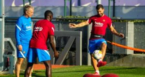 ديمبلي وأجويرو يشاركان فى تدريبات برشلونة الجماعية استعدادا لمواجهة فالنسيا