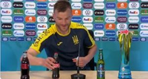 نجم المنتخب الأوكرانى يتحدي رونالدو ويضع زجاجات المياة الغازية أمامه.. فيديو