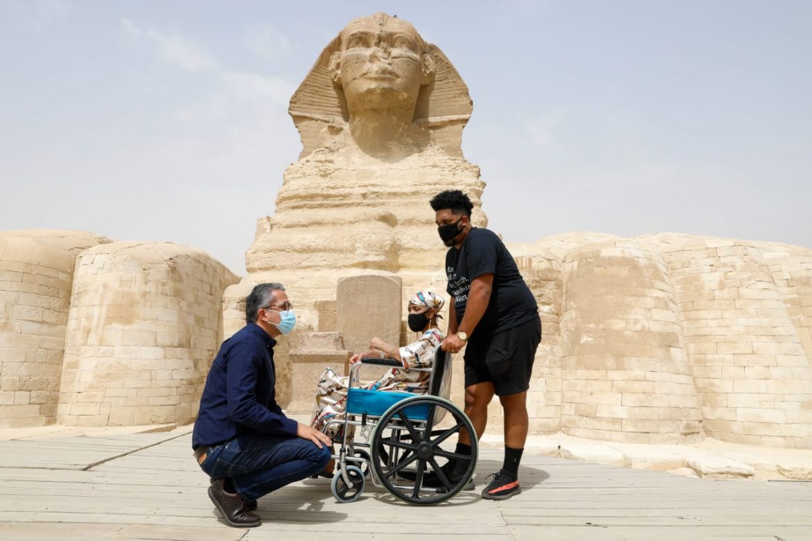In front of the Sphinx, Gloria insisted on getting off her wheelchair to fulfill her dream and take a commemorative photo in front of the Great Sphinx.